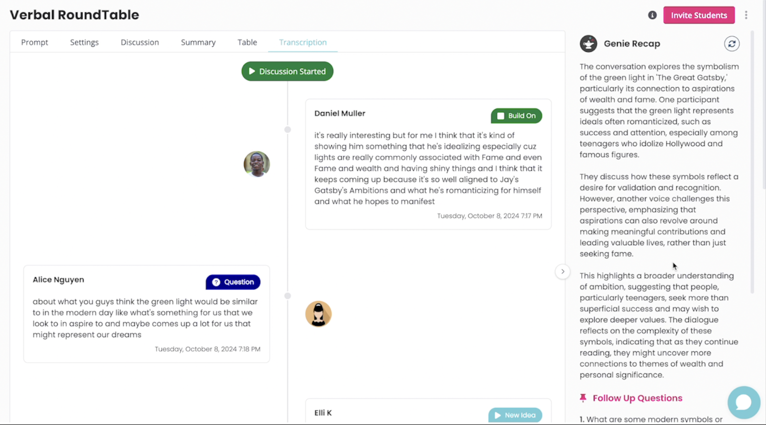 During or after the discussion, you can generate a Genie Recap that includes a summary, follow-up questions for deeper engagement, and a word cloud highlighting key themes.