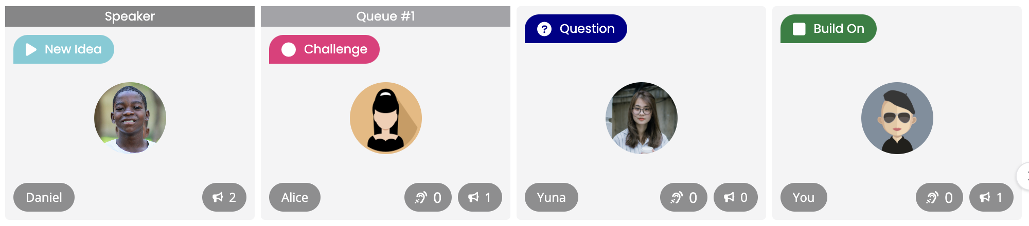 Your and your peers will be discussing a given topic and each person will "tap in" when they have something to say. You can tap in with a New Idea, a Challenge, a Build On or a Question. Everyone will taking turns being the speaker to share what they'd like to say.