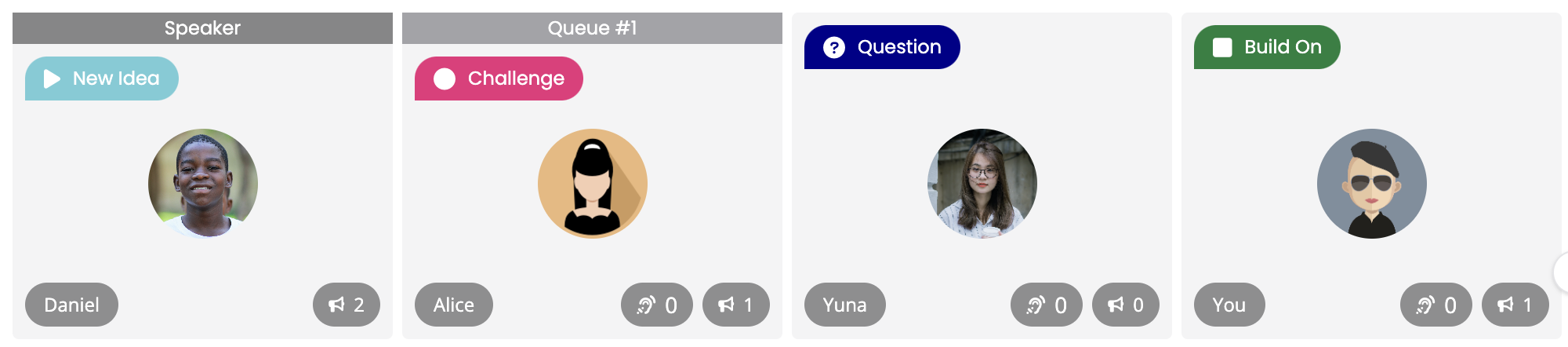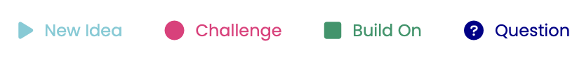 - The tap in types (new idea/challenge/build on/question) scaffold discussion skills and guide students to be intentional about their contributions. You will notice that students will begin using that language explicitly: "I want to build on what Alex said..." or "I have a question about...".