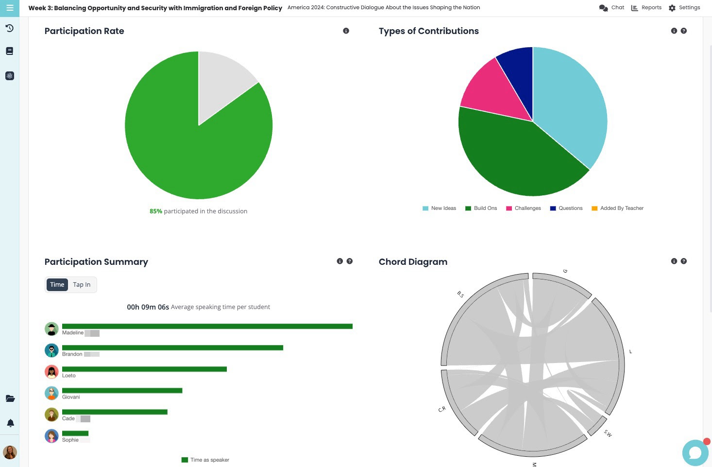 - Lastly, you get rich data visualizations (see below). Participation rates, types of contributions, speaking time, flow of conversation, a word cloud of major themes, and a summary of the content of the conversation. These help engage students in metacognition about their own participation but also the class dynamics as well.