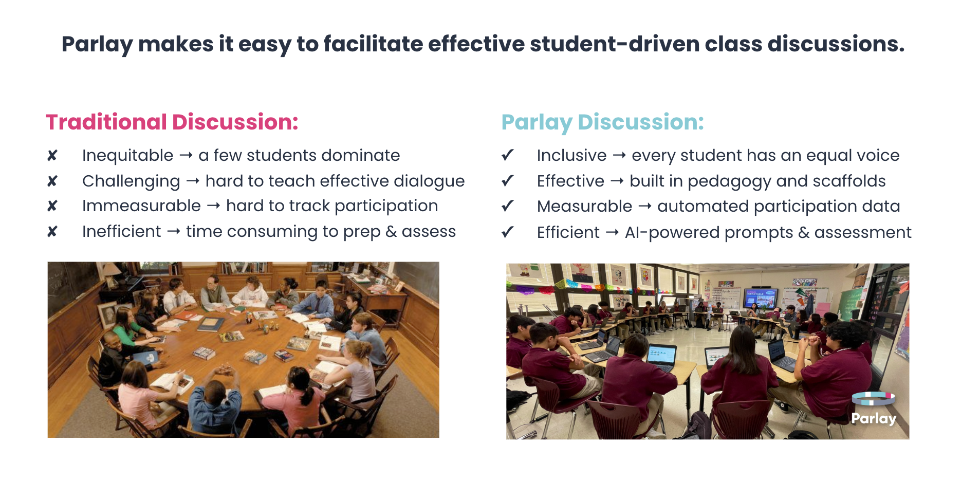 - The benefits of student-driven discussions are well documented - they create a space for students to take ownership over the conversation, with the teacher in a facilitator role. Students lead the conversation but you as the teacher can still manage the speaking queue as needed. You can view student notes, nudge for direct feedback, tap in to share your input, assess and take your own notes during the conversation.