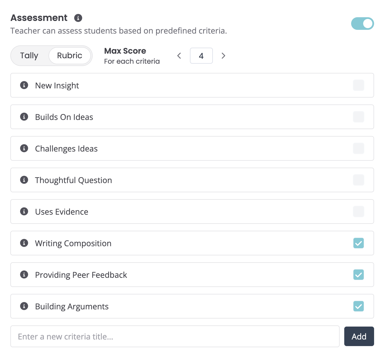 + You can still customize your own criteria based on your specific learning objectives and curriculum expectations when you are editing the RoundTable.