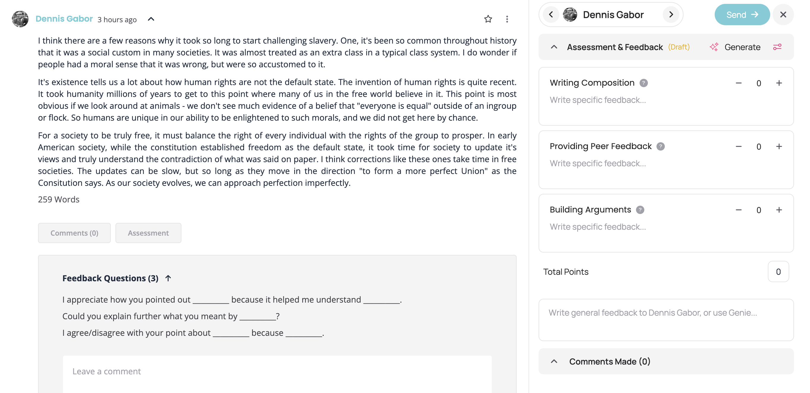 3. Provide written private feedback to students as needed. (Click the 3 dots at the top to access the Genie Grader to draft feedback and grades. Only available on premium accounts).