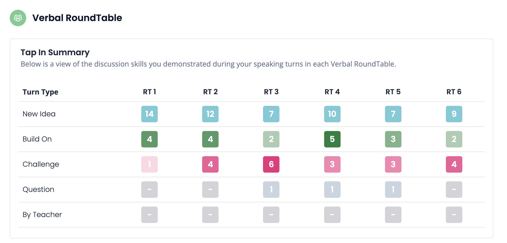 Note: Students also have access to this data! You can pause the discussion halfway through and prompt students to consider their own participation by having them click the "Summary" button on their screen.