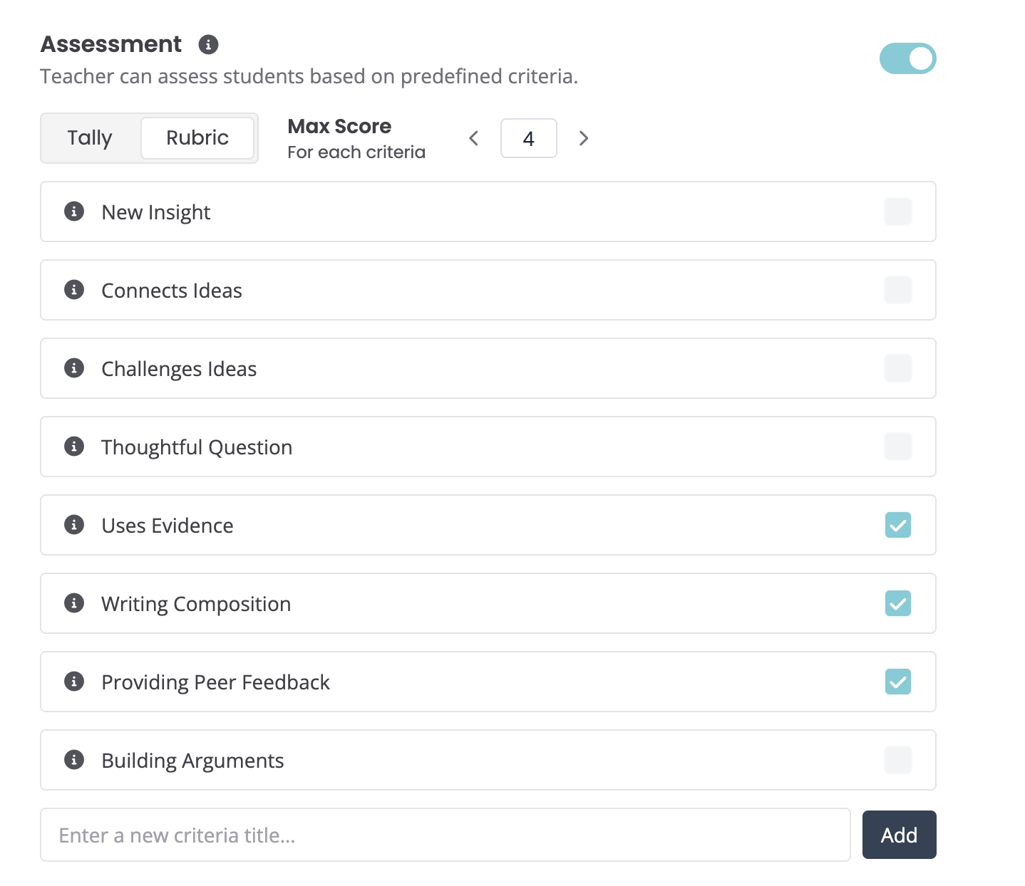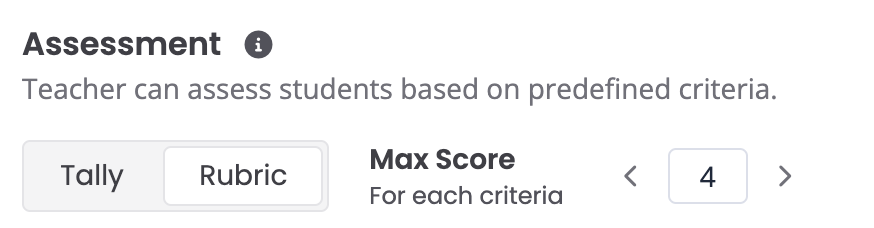 Turning the Max Score off will allow you to use the Parlay Approach to Harkness - the tally system. You can assess students during the Verbal RoundTable using tally's for each time they demonstrate the criteria. See our article on assessment best practices for more detail.